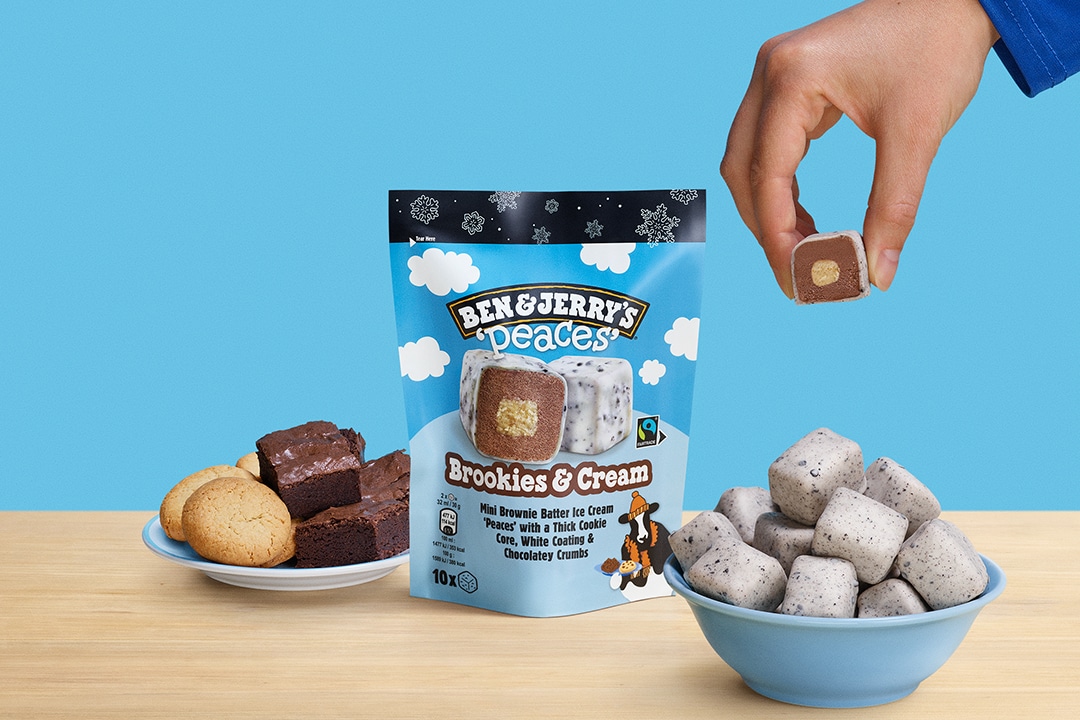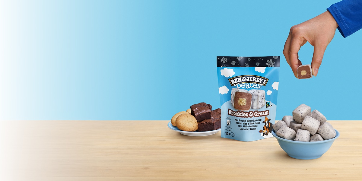 Brownies, tick. Cookies, tick. Brookies inspired ice cream in snackable Peaces? BIG TICK! Brownie batter ice cream Peaces with a thick cookie core, covered in a white coating and chocolatey crumbs, they're snack-sized Peaces of ice cream euphoria that are perfect for sharing - or keeping all to yourself. Enjoy anytime, anywhere!